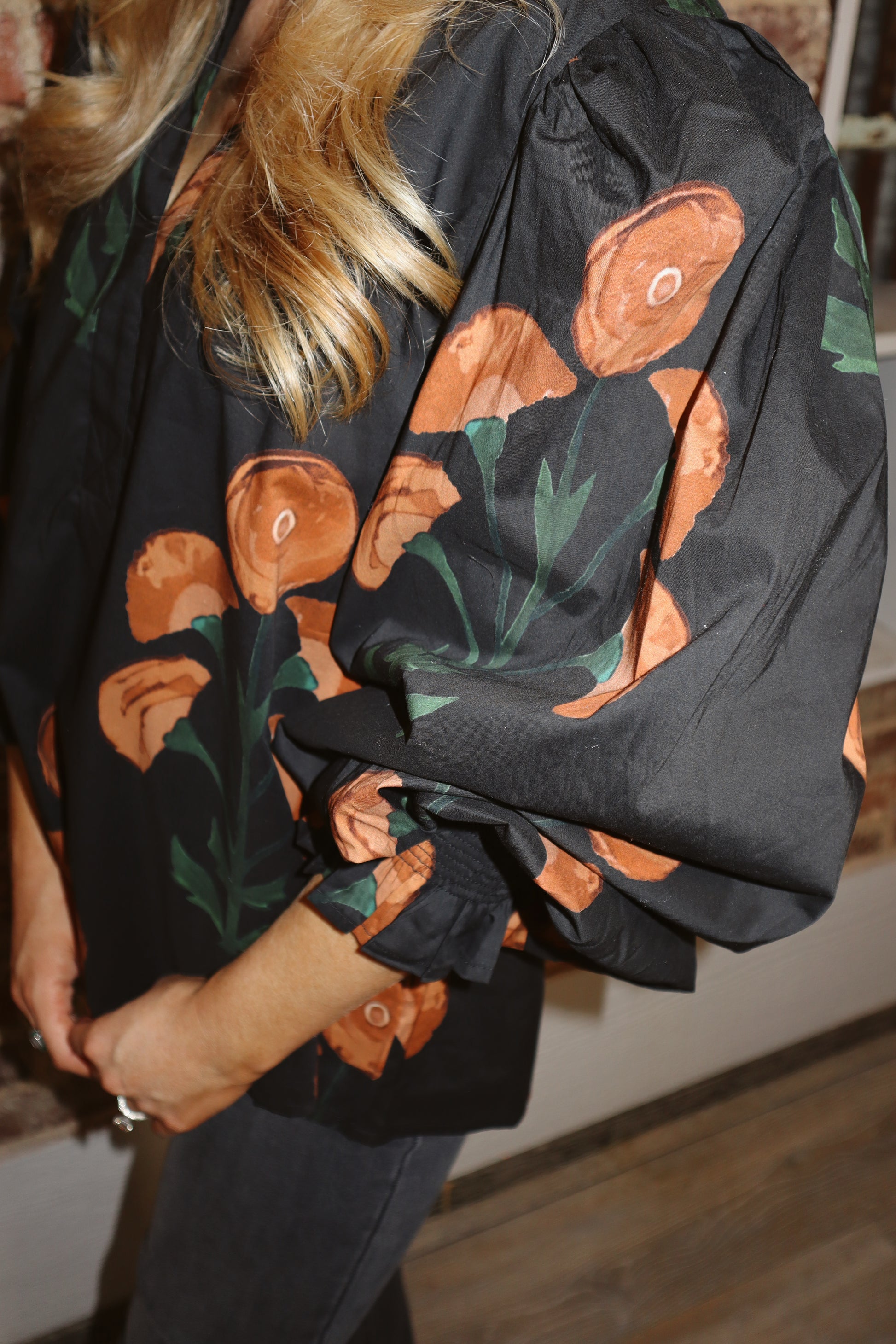 Elevate your everyday style with this Black Bloom Top, a charming piece that blends vintage-inspired details with modern flair. The striking black fabric is adorned with dark floral accents that add subtle sophistication. Long puff sleeves create a romantic silhouette, while the collared split neckline offers a flattering, versatile look. Smocked cuffs provide a polished finish and comfortable fit. Perfect for layering or wearing solo, this top transitions effortlessly from casual outings to weekend gatherings.