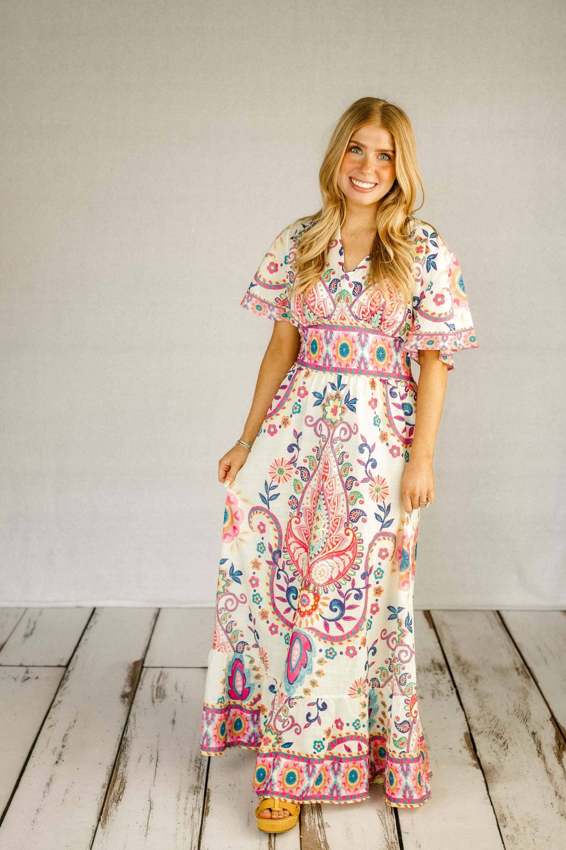 This charming dress features an eye-catching oversized paisley print in vibrant coral pink, turquoise blue, and royal navy against ivory fabric. The flutter sleeves and smocked empire waist create an effortlessly elegant silhouette perfect for various occasions. Features: • 100% Polyester