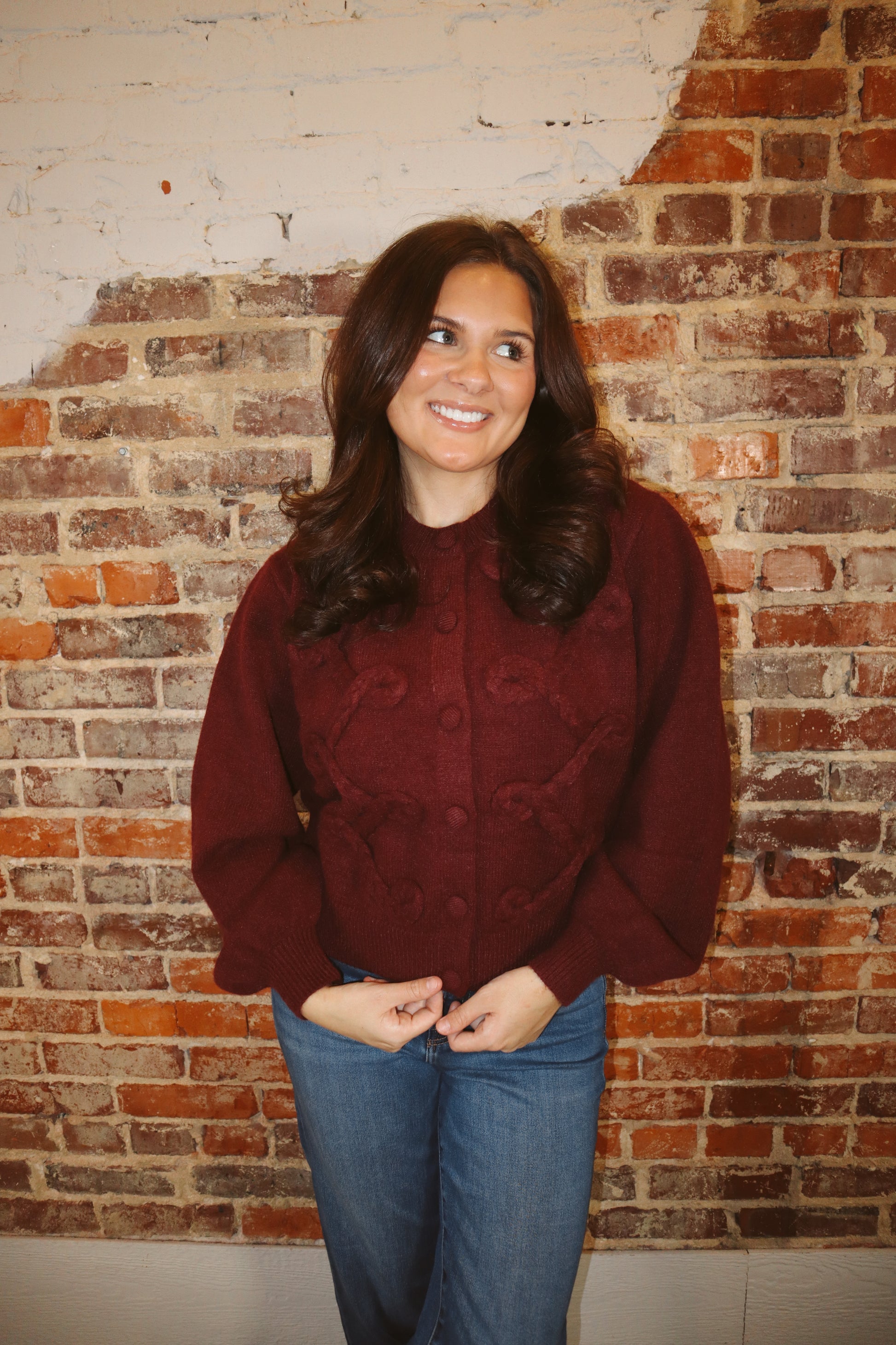 Wrap up in cozy style with this solid long sleeve knit cardigan in a rich deep cranberry hue. The looped trim detail at the front adds a touch of texture and visual interest, while the button closure makes it easy to layer over your favorite pieces. Perfect for holiday gatherings and everyday warmth, this versatile cardigan transitions seamlessly from season to season.