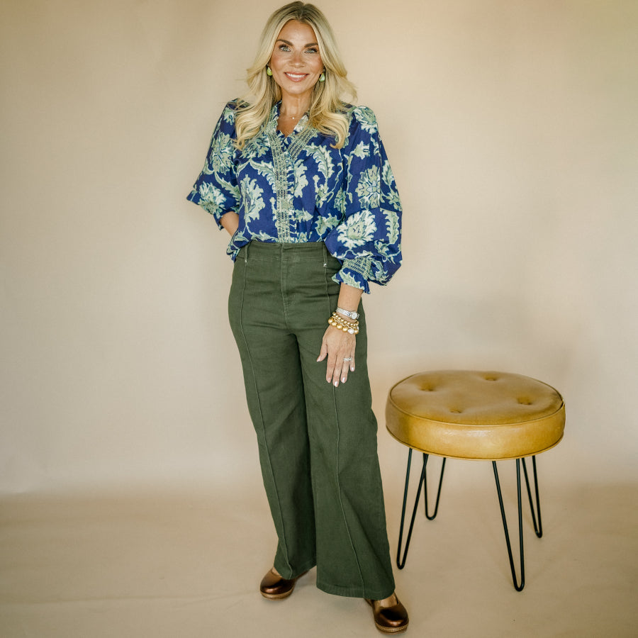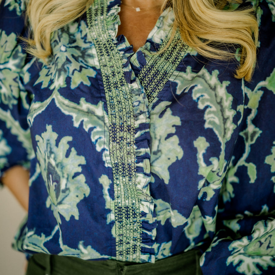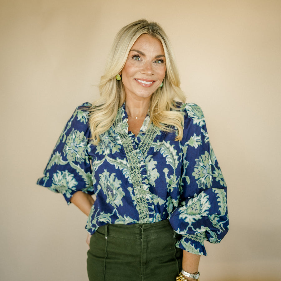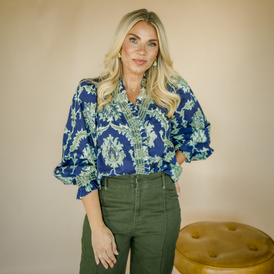 The Crisp Morning Top offers a relaxed, casual look with its navy floral print and subtle sage accents. Crafted from lightweight woven fabric, it features a flattering ruffled trim V-neck with delicate smocked detailing, and smocked cuffs finished with a charming ruffle edge. This unlined, non-sheer top provides comfort and breathability, making it perfect for everyday wear.