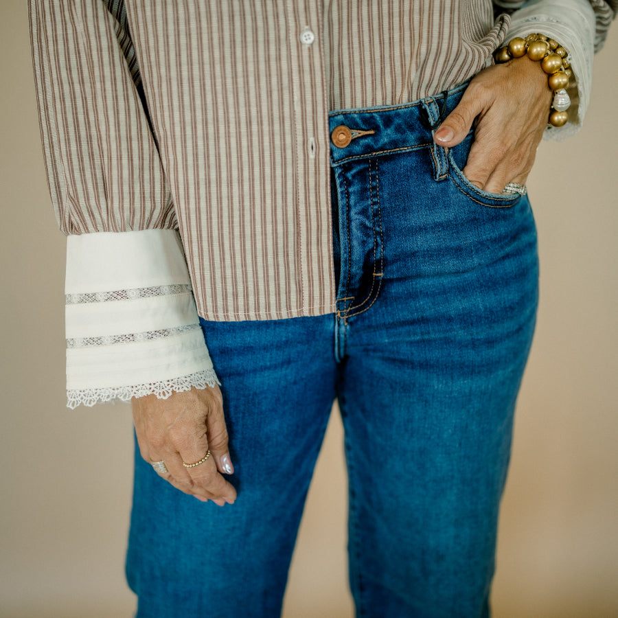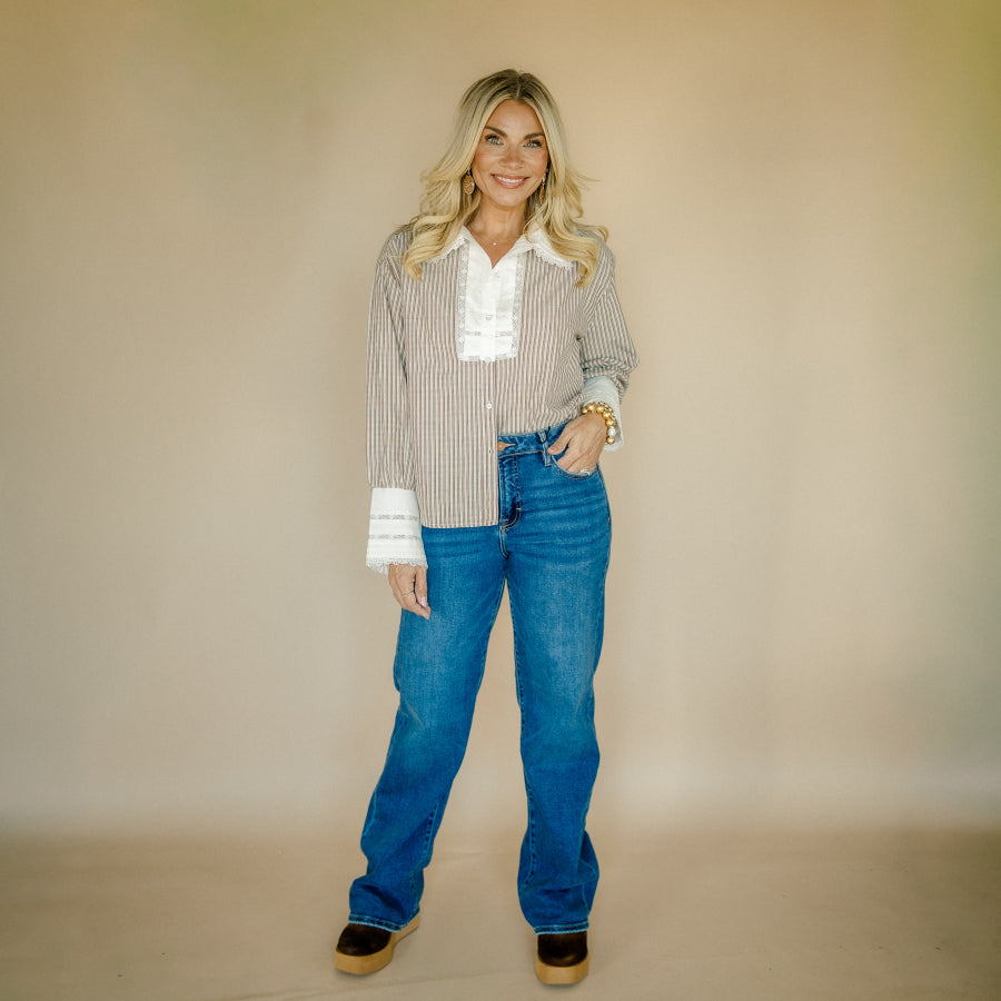 This casual shirt features a classic stripe pattern with a button-front design for easy wear. It is accented with delicate lace trim that adds a touch of femininity, while the contrasting collar and band detail provide a stylish, standout look. Perfect for everyday comfort with a subtle flair.