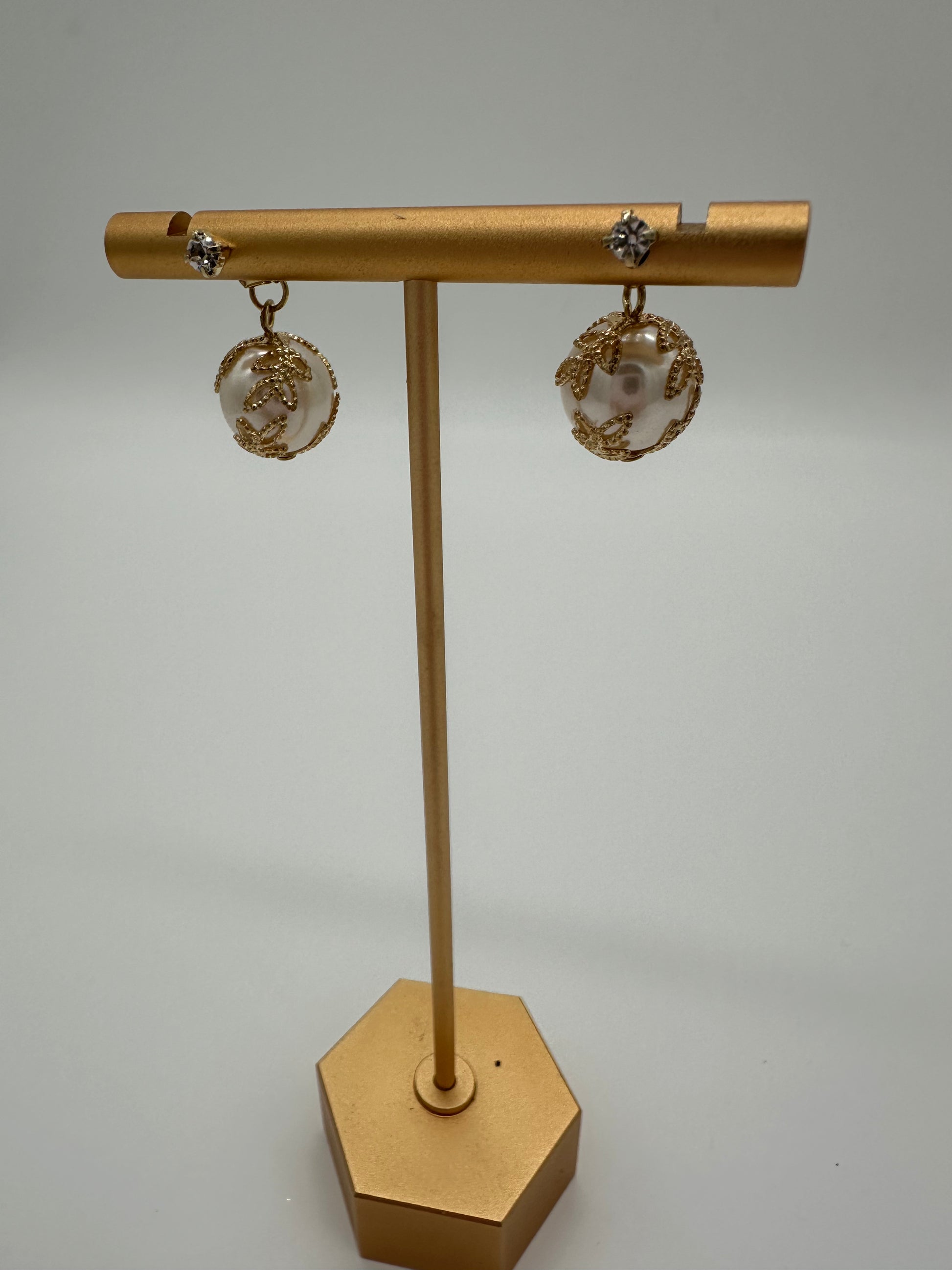 Indulge in understated elegance with our Dangle Post pearl Earrings. Each lustrous pearl is delicately wrapped in Gold leaf, while the rhinestone post adds a touch of sparkle. Perfect for any occasion, these earrings are a timeless addition to your jewelry collection.