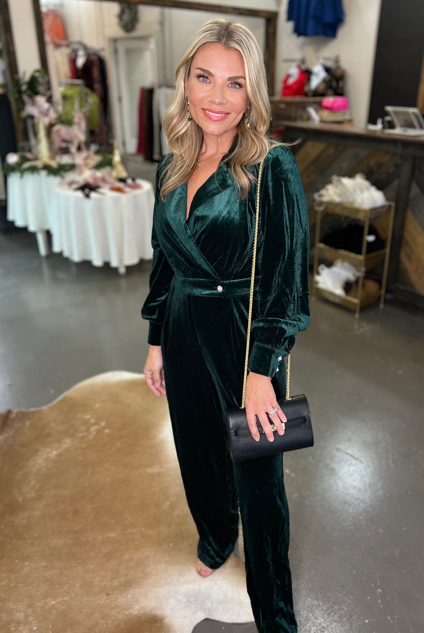 Look fab this season in our Emerald Velvet Jumpsuit! This hunter green showstopper will turn heads and make a Christmas statement. With its wide legs and tailored silhouette, you’ll look like a million bucks!