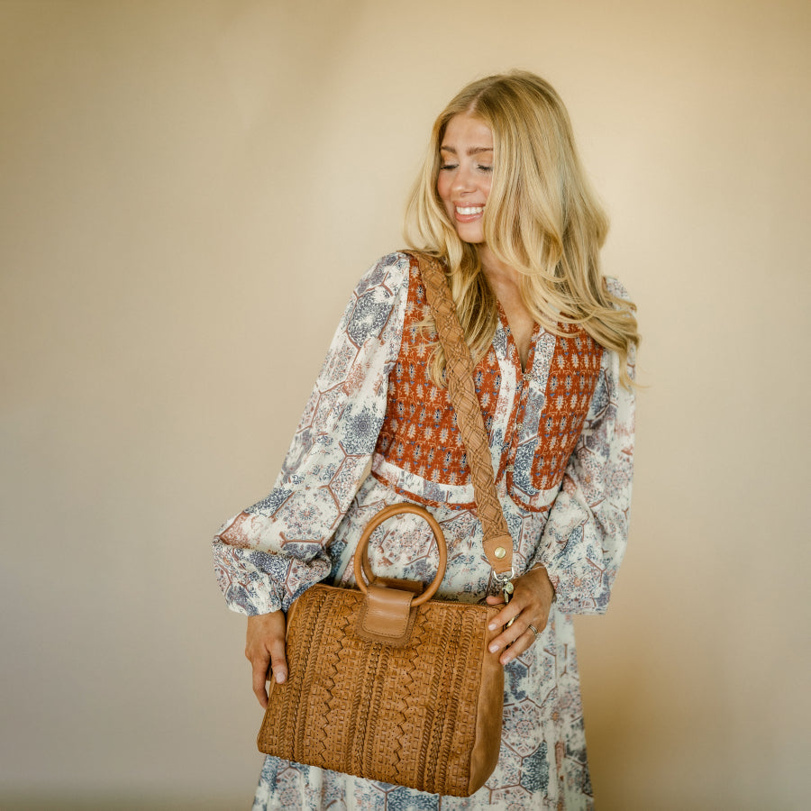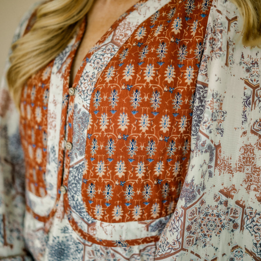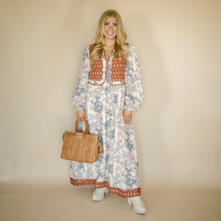 The Fireside Stroll Midi features a unique contrast quilted vest bodice with a flattering V neckline and faux button-down detail. Its distressed floral mosaic print adds subtle charm, while the long puff sleeves with elastic cuffs offer comfortable movement. Complete with handy pockets and a fully lined design, this dress combines casual style with practical wearability perfect for everyday outings.