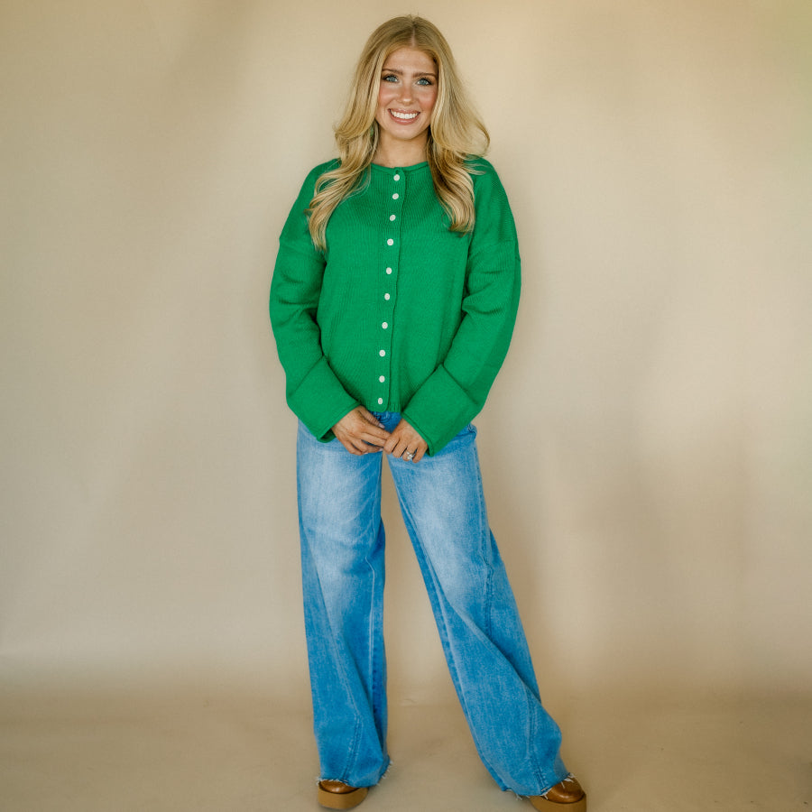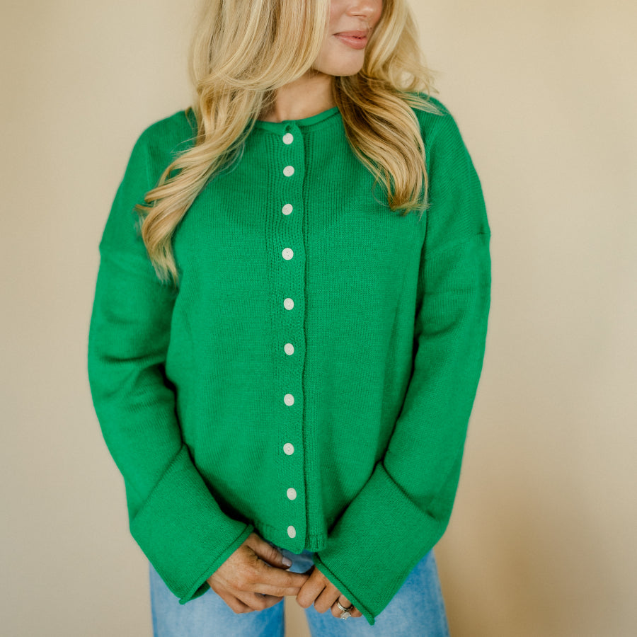 Layer up this season with the Holly Knit Cardigan, a lightweight button-down sweater in bright kelly green. Perfect for holiday gatherings and everyday styling, this piece transitions effortlessly from casual to dressy. The relaxed fit and soft knit fabric make it ideal for layering over your favorite tees or dresses. Whether you're heading to a festive celebration or keeping cozy at home, this versatile cardigan is a wardrobe essential that works year-round.