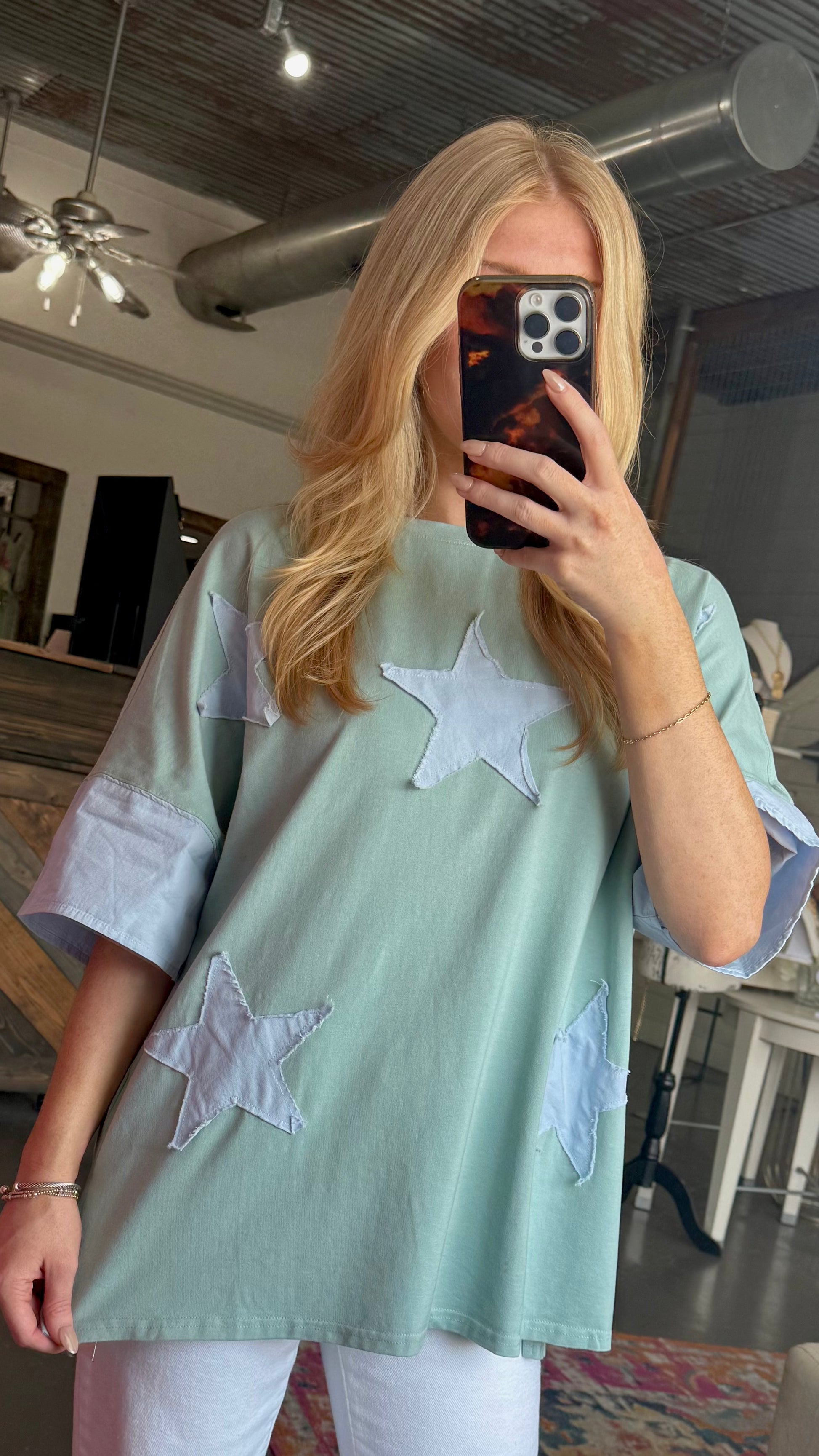 The Seeing Stars Oversize Tee features a comfortable, loose fit with eye-catching denim patchwork stars. This casual tee adds an edgy flair to your everyday look, blending soft colors with a bold design for effortless style.
