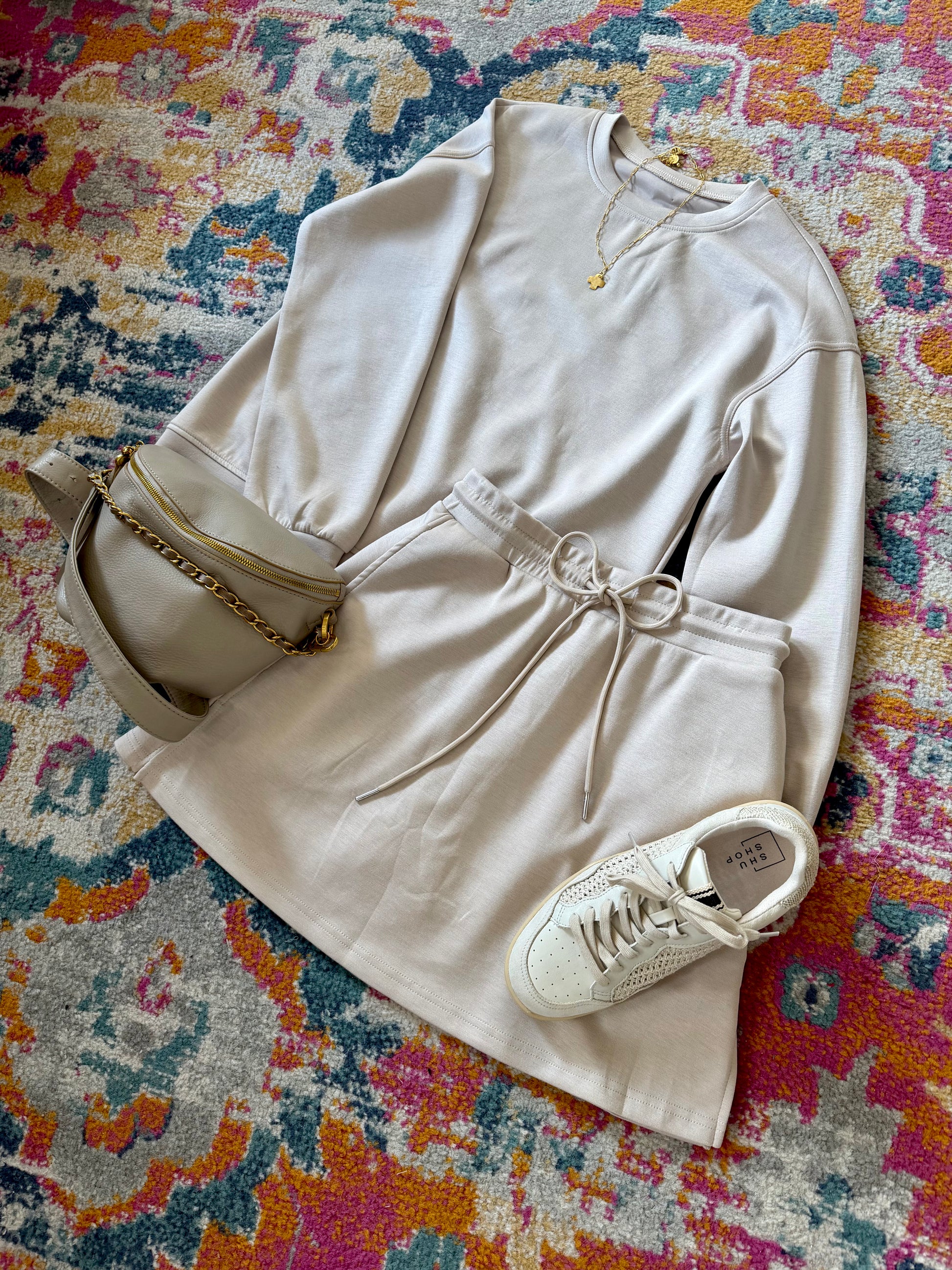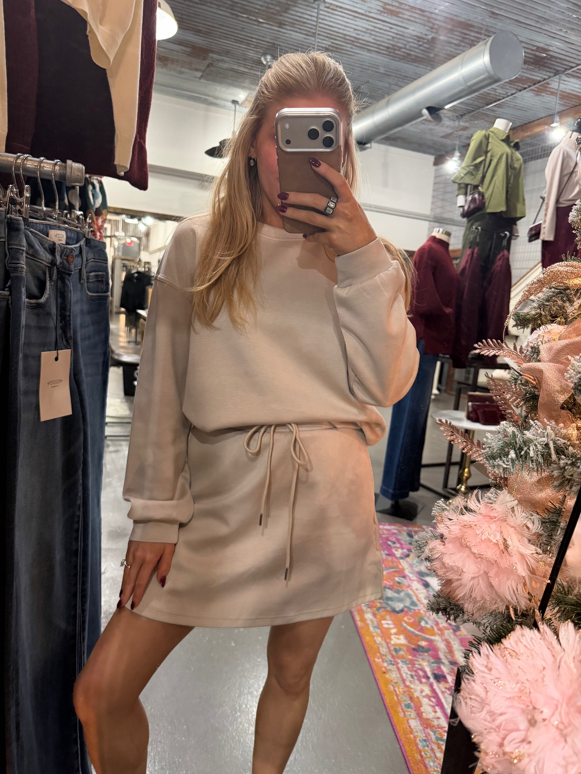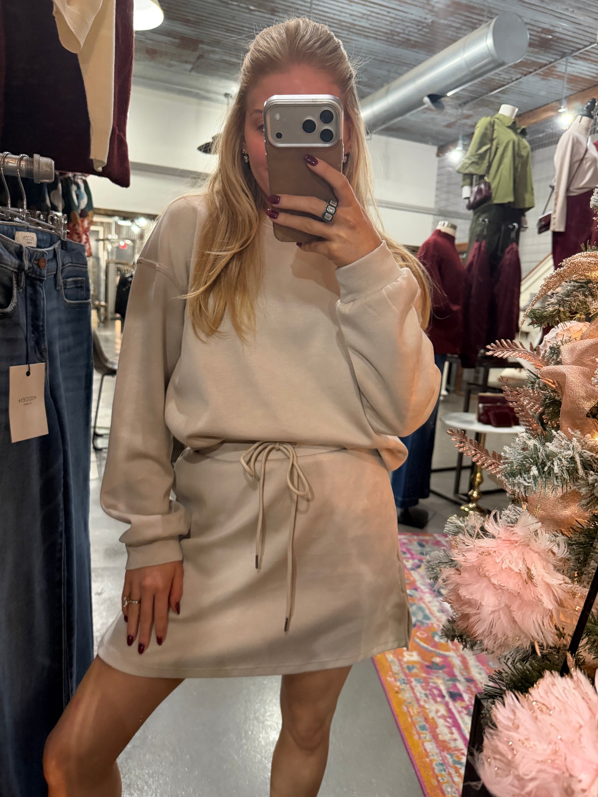 Elevate your fall fashion game with our September Skies Set. This comfy two-piece set includes a grey skort, and is perfect for casual yet stylish outfits all season long.