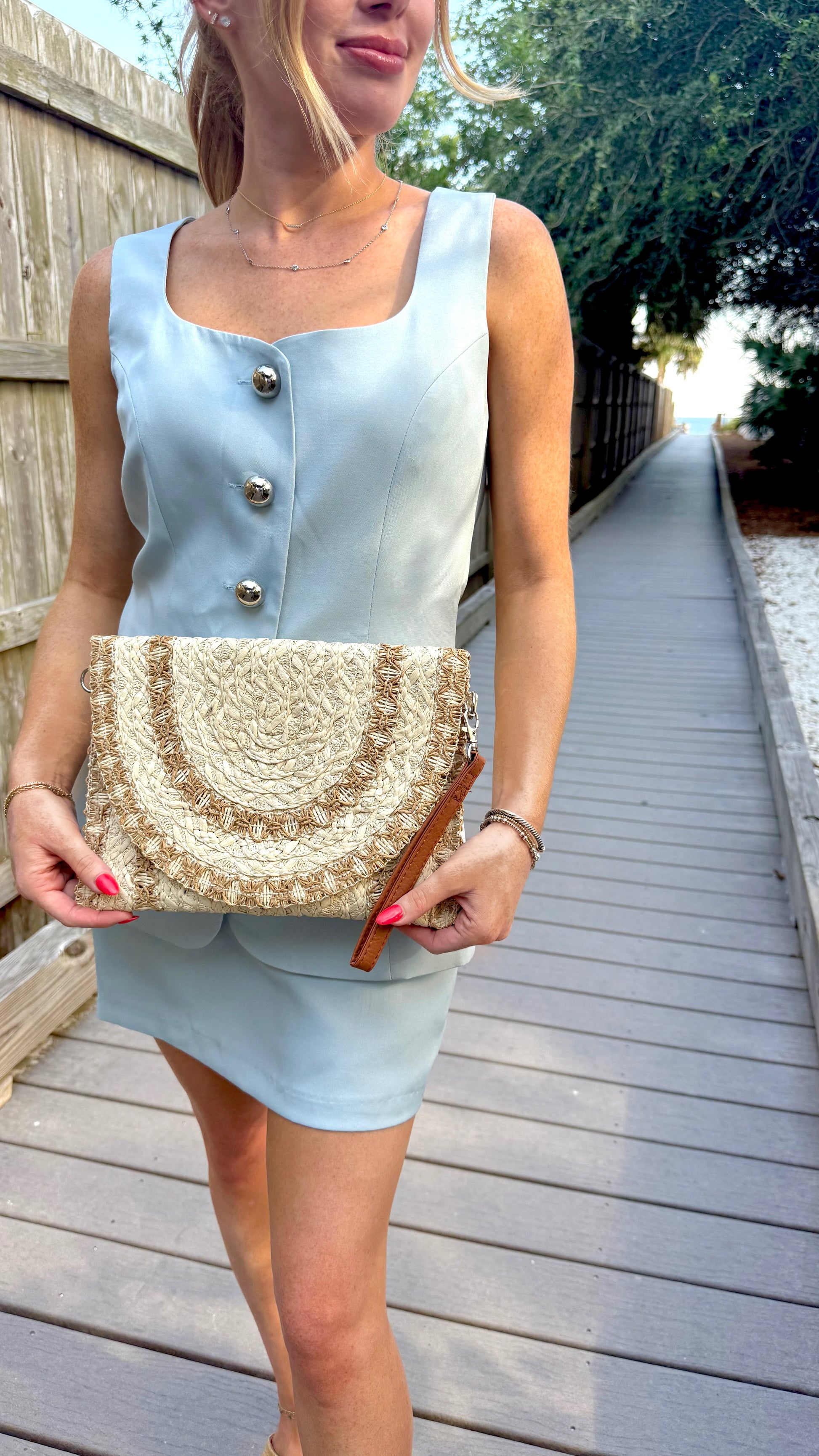 Introducing the Straw Stitch Clutch - the perfect blend of modern style and vintage charm. This luxurious clutch features intricate straw stitching and measures 11 inches in length and 8 inches in height. Elevate your ensemble with this versatile accessory.