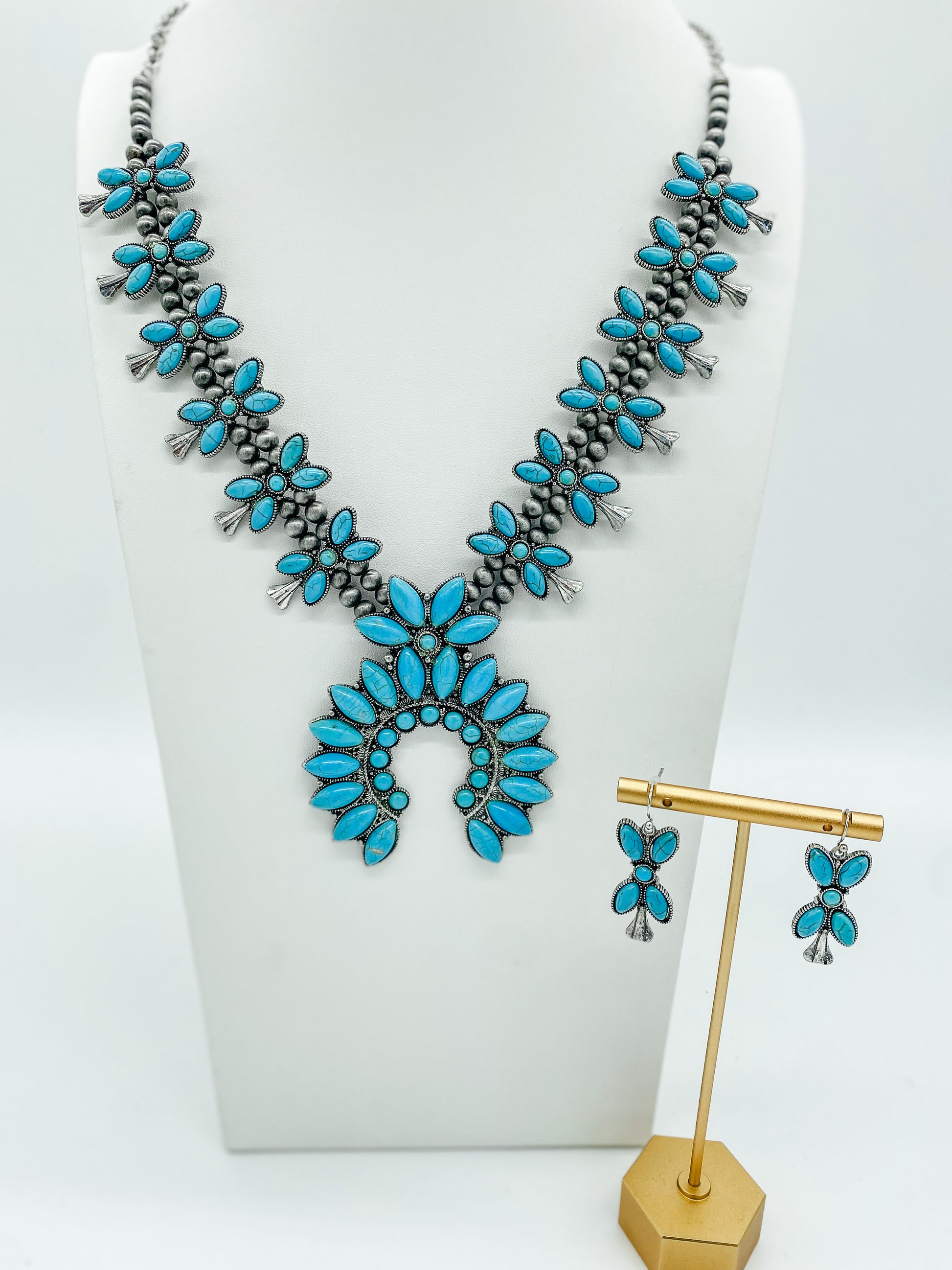 This beautiful turquoise western set features a silver tone metal and turquoise stones. The set includes a necklace and earrings with a classic squash blossom design. Wear this timeless set together to add a touch of western flair to any outfit.