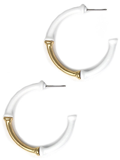 These white-coated bamboo hoop earrings combine a classic shape with a fresh, modern twist. Lightweight and stylish, they add a subtle yet chic touch to any outfit, perfect for everyday wear or casual outings.